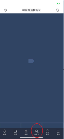 点击屏幕空白处,调出软件下方选项卡。点击“参会人”按钮可跳转到所有参会人列表。点击目标用户右侧摄像机按钮,可显示该用户所有连接的视频设备,根据需要选择显示的画面。